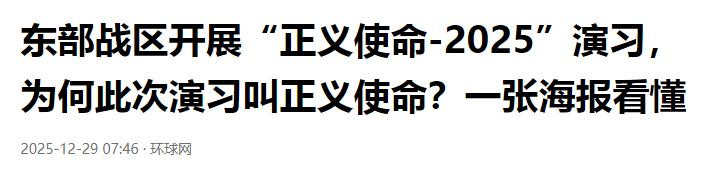 环球时报:2025-12-29:东部战区开展“正义使命-2025”演习,为何此次演习叫正义使命?一张海报看懂
