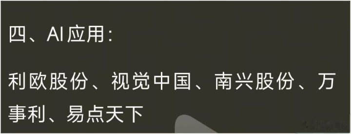 AI应用板块看起来繁花似锦。视觉中国的视觉内容+AI,易点天下的跨境营销+AI,都是把AI技术和自身业务结合得比较好的。但也有些企业,AI应用还停留在概念阶段,大家得仔细分辨。AI技术正在深刻改变各个行业,但最终能真正把AI转化为业绩增长的企业,才是值得关注的。